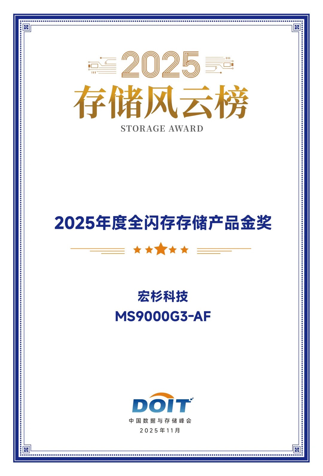 11月18日,由DOIT主办的2025中国数据与存储峰会在北京隆重召开。宏杉MS9000G3-AF系列高端全闪存储凭借面向AI时代的强大技术能力与产业支撑价值,一举斩获“2025年度全闪存存储产品金奖”,再度彰显了宏杉科技在高端存储领域的自主技术积淀与核心实力。